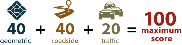 (40 points) and traffic (20 points) — add together to reach the potential maximum score of 100 points. Geometric and roadside elements are weighted more heavily than traffic elements because they’re likely to remain in place the longest (e.g., the shoulder width usually isn’t changed once constructed). Less permanent traffic devices, however — like signs and markings — can more readily be replaced as design standards evolve.